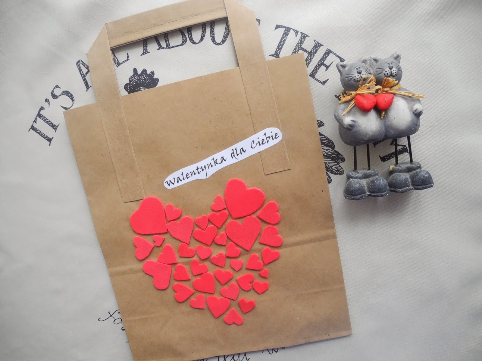 Dziś mam dla Was "małe co nieco" z serii "zrób to sam". W czasach kiedy jest wszystko i nie trzeba się z niczym wysilać, bo wystarczy "kupić i już" mnie kusi, żeby włożyć w coś trochę pracy i serca. Pomysł nie jest wielce oryginalny, ale nie mogłam się oprzeć jak zobaczyłam w sklepie te papierowe torebki:))) Są bardzo na topie, bo szary papier wrócił do łask - jeśli chodzi o pakowanie prezentów.